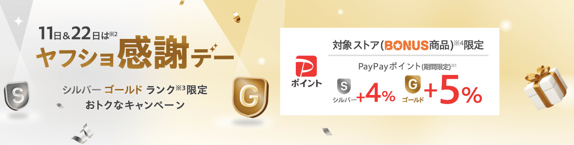 - ヤフショランクのゴールド・シルバーランクが対象でポイントが最大+5%とお得です。